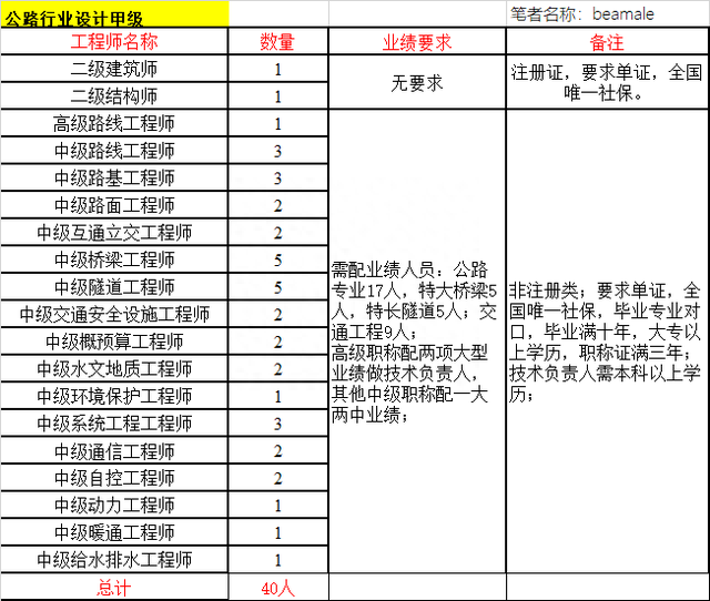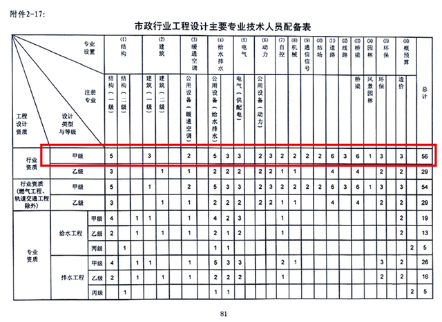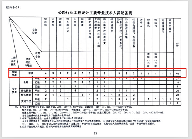 由此可以看出,公路行业设计甲级人员的配备,需要4个专业的人员业绩,其中公路专业方面的人员业绩需要17个人,特大桥梁专业和特长隧道专业方面的人员业绩各需要5人,交通工程专业方面的人员业绩需要9人,一共36个人需要配备业绩。而环保和动力两个专业不是主导专业,以及2个注册人员,不要求考核业绩。
