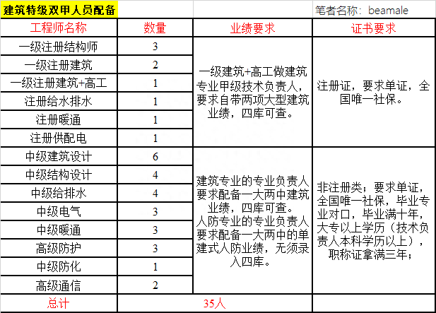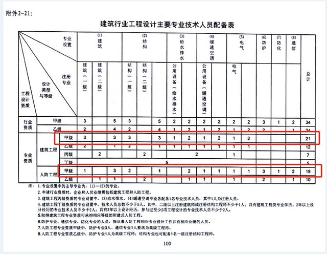 对于建筑工程施工总承包特级资质的申报,约从2018年底开始,所配备的设计人员及其业绩需要在全国建筑市场监管平台(四库一平台)上显示。因此,按照建筑工程设计专业甲级和人防工程设计专业甲级的配备标准,建筑工程施工总承包特级资质设计人员配备要求如下: