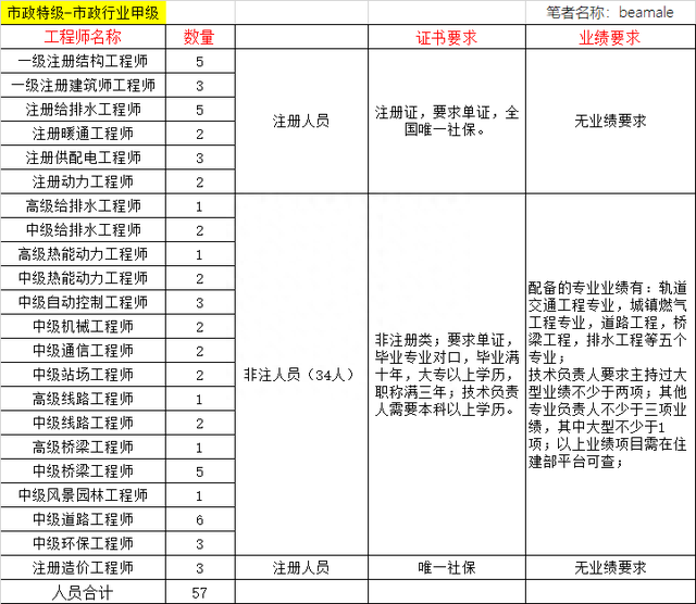由这表可看出,申报市政公用工程施工总承包特级资质时,要按市政行业甲级的人员及人员业绩要求来配备,这就要求所配备的非注册人员需要配备有轨道交通工程专业,城镇燃气工程专业,道路工程专业,桥梁工程专业,排水工程专业等五个专业的人员业绩;具体每个职称专业对应的业绩具体再聊。