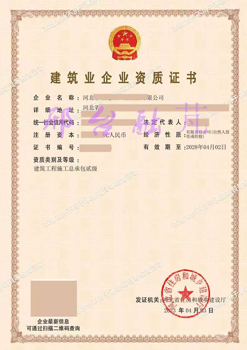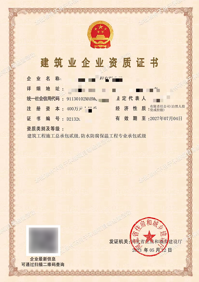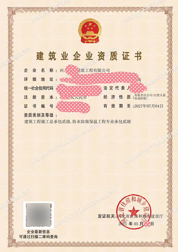 转让资质:建筑工程施工总承包贰级、防水防腐保温工程专业承包贰级